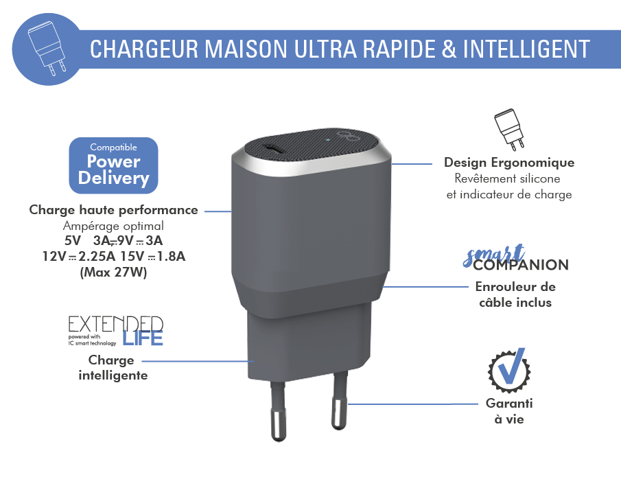 Its Power Delivery compatible charging protocol is much more efficient than conventional charging technologies. Compatible with iOS (Apple) and Android (Google, Samsung, Xiaomi, Oppo…) devices, it offers an ultra fast, safe and convenient alternative to charge all your devices.