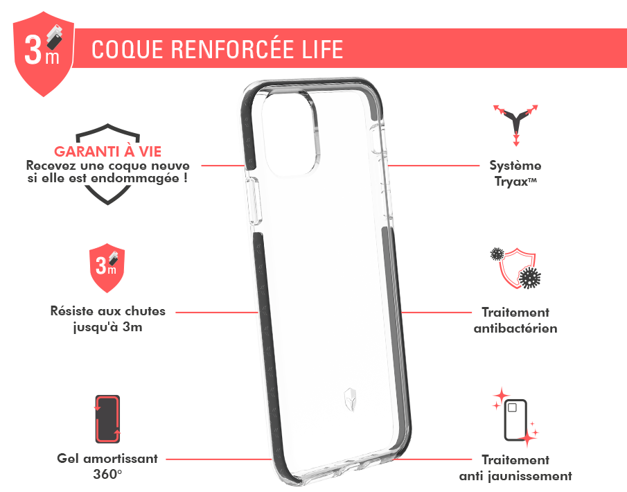• Contenu du pack : Coque renforcée LIFE 3m + Garantie à vie